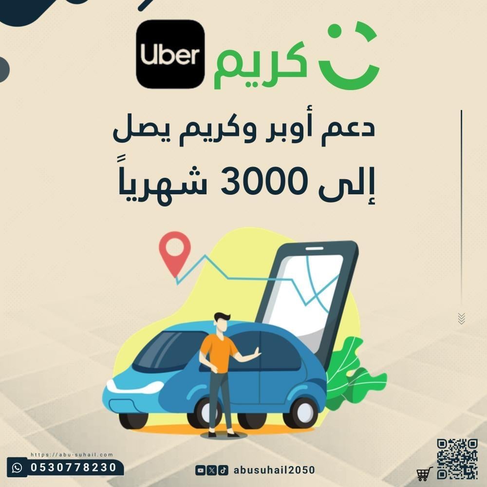 نبذة عن دعم اوبر وكريم : هو دعم حكومي يدعم الكابتن لنقل الركاب في برنامج اوبر وكربم يصل الدعم الشهري عند اتمام الرحلات المطلوبة في الشهر من 2400 الى 3000 ريال شهرياً لمدة سنتان .